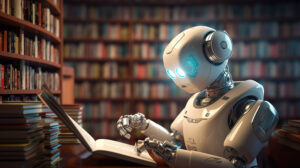 ai robot reading book in library, learning and technology knowledge concept, Generative AI